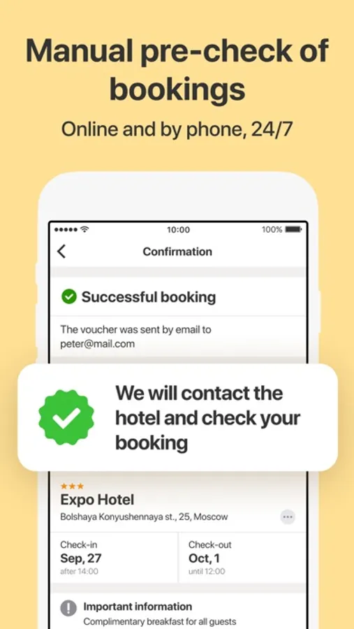 We guarantee maximum reliability. So that you can be sure that your clients are expected in the hotel, we carry out a manual pre-check of all bookings and recheck the details of each booking with the hotel.