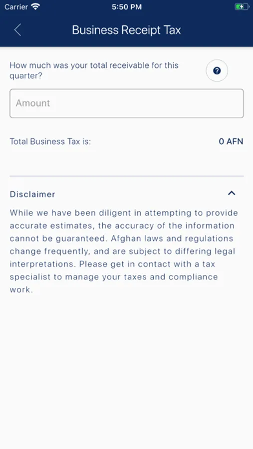 Disclaimer: While we have been diligent in attempting to provide accurate estimates, the accuracy of the information cannot be guaranteed. Afghan laws and regulations change frequently and are subject to differing legal interpretations. Please get in contact with a tax specialist to manage your taxes and compliance work.