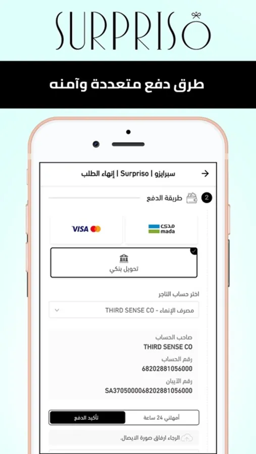 تم توفير خيارات دفع متنوعة لتُسهّل لكم إرسال هداياكم بطريقة مُيسرة عبر خيارات الدفع الآمنة، عن طريق: (الفيزا ، ماستر كارد ، التحويل البنكي ، و خدمات مدى للدفع الالكتروني)