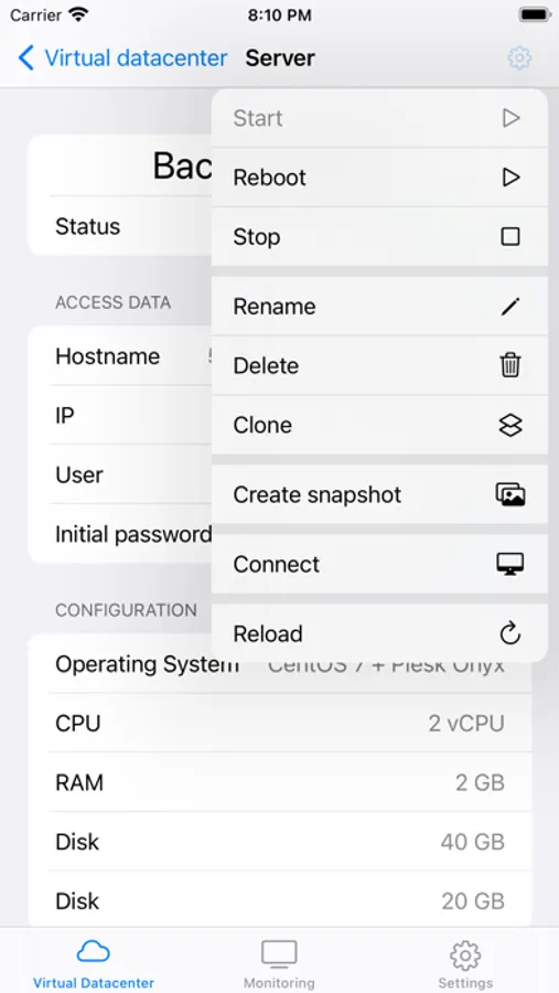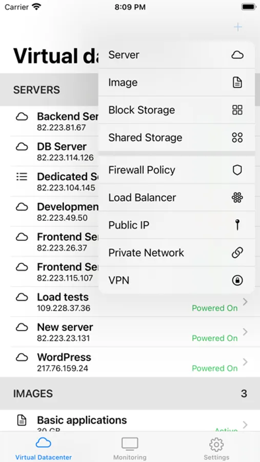 - Servers (cloud and dedicated) management: list, creation, deletion, power on/power off, reboot, snapshots, connect (RDP, SSH)...