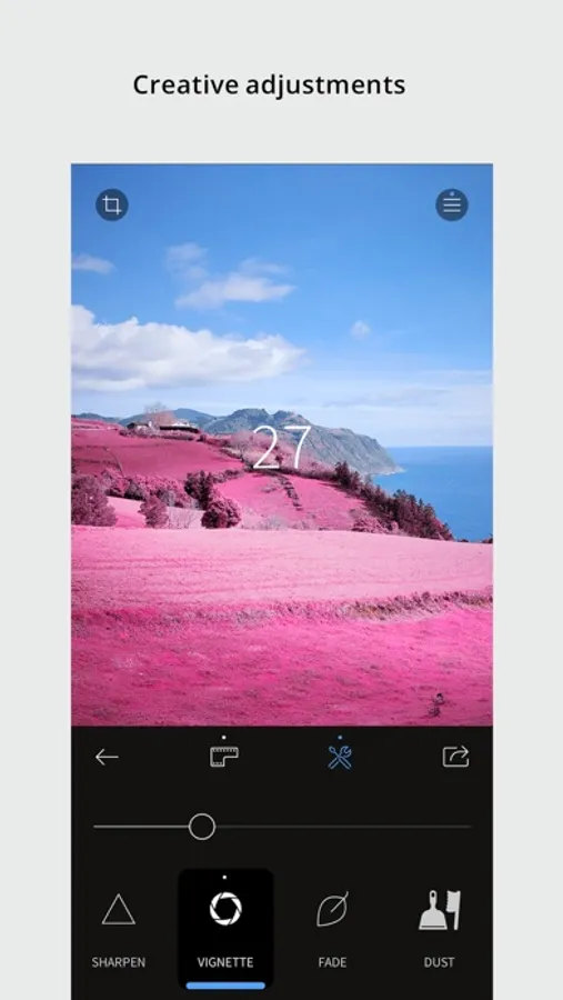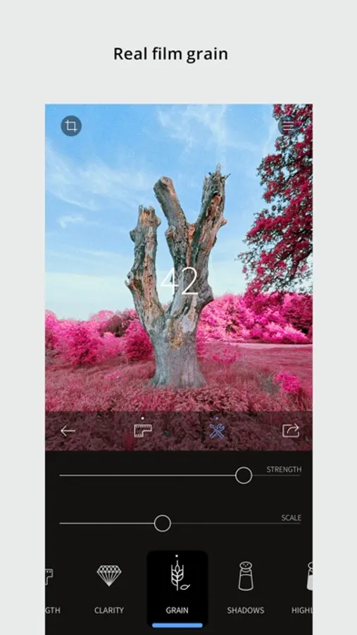Use RNI Aero image adjustment tools to make sure your images perfectly meet your creative vision. You can crop and rotate, alter the brightness, contrast, enhance shadows and highlights, add vignette and real film grain, and more.