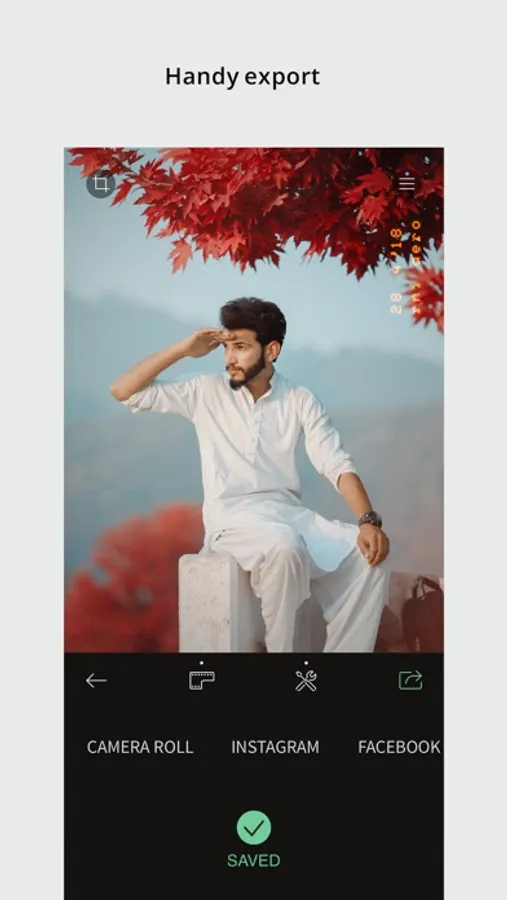 Share your photos to your social networks directly from the app. Supported networks include Instagram, Facebook and Twitter.