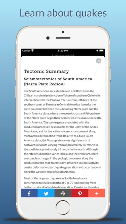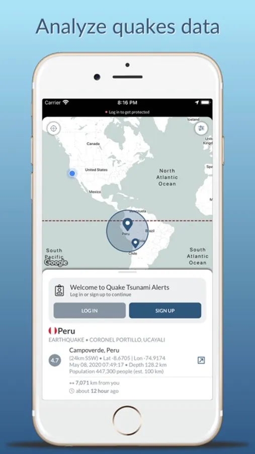 Each quake is represented by a marker on the map. Tap on the marker to open the details panel and dig more into the quake's data (depth, population estimates, etc.). The app is directly connected to our web platform, where you can learn more about a specific seismic event or, in general, get access to a vast literature concerning earthquakes and tsunamis (fault lines, features, history, etc.).