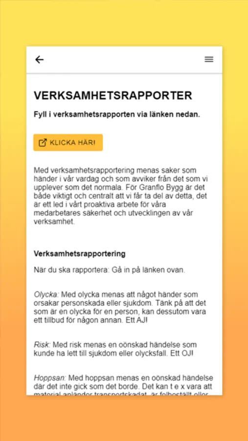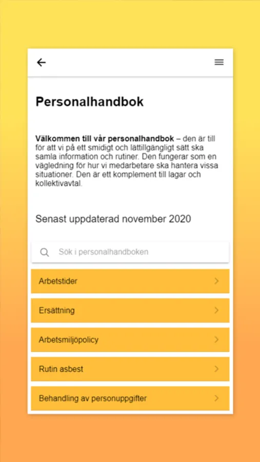 Med hjälp av appen når vi effektivt ut med information till våra anställda samt andra intressenter. Som anställd har du tillgång till bland annat vår personalhandbok, rapportering och nyheter.