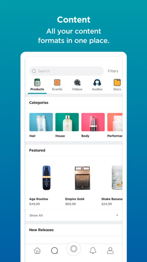 * Organize all your content formats in one place: Products, Events, Videos, Audios, Documents and much more.