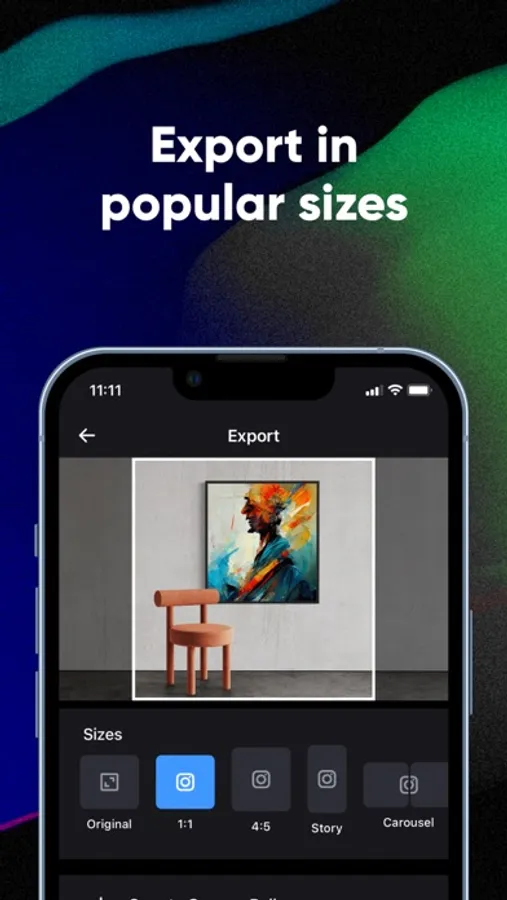 Who needs a gallery, when you have social media? Export in high resolution in popular sizes and even carousels for a closer, cooler view. No one will even be able to tell it’s a mockup.