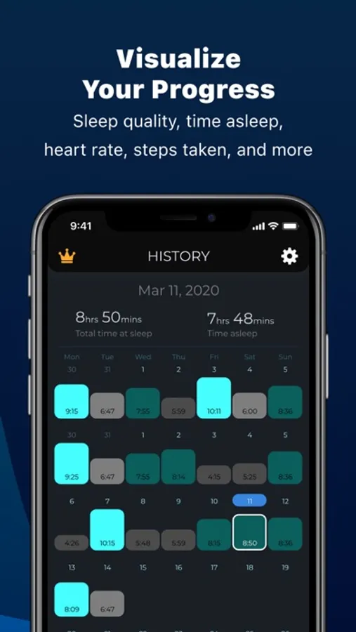 - View your sleep history with overviews per night, week, month, and all-time.