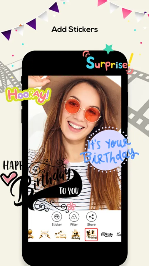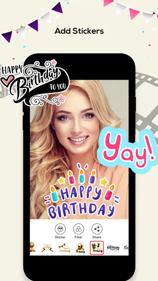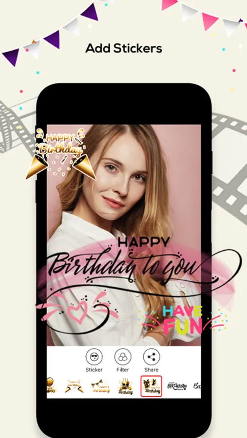 Birthday Video Maker with Song App lets you easily Create Videos with your own photos, Select birthday music track, add birthday stickers, apply filters effects to video.