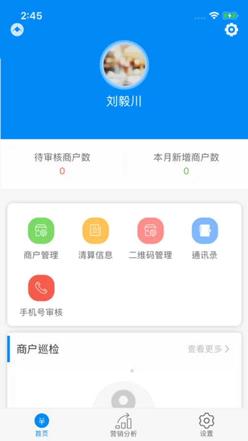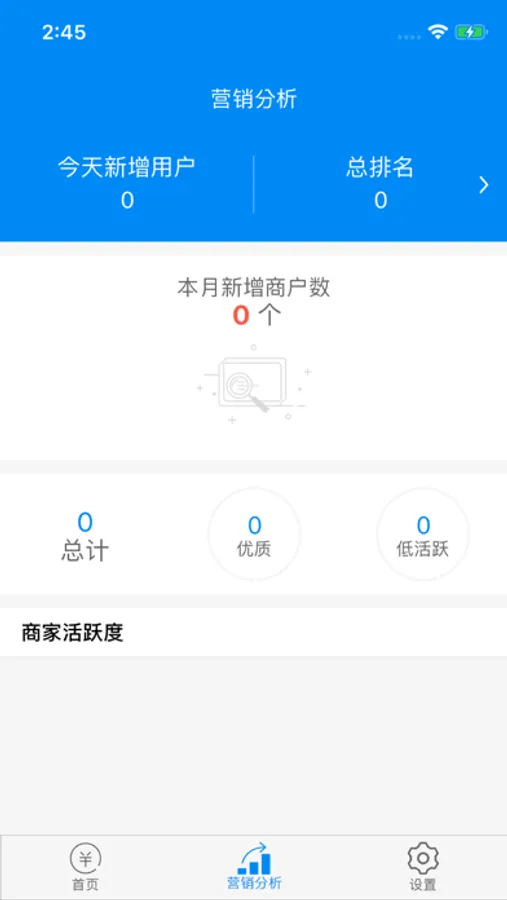 营销分析:显示新增商户数量、客户经理排行、商户活跃度及活跃度排行等信息;