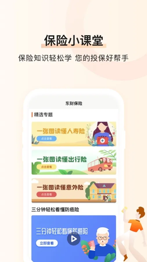 产品涵盖多家保险公司的健康险、意外险、寿险、年金、财产险等各种保险产品。为您精选,在线投保,您的牵挂,东财保险守护。