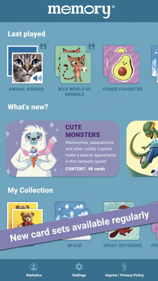 The Ravensburger memory® app offers many new and classic card sets. New sets are regularly added and can be tried out for free.