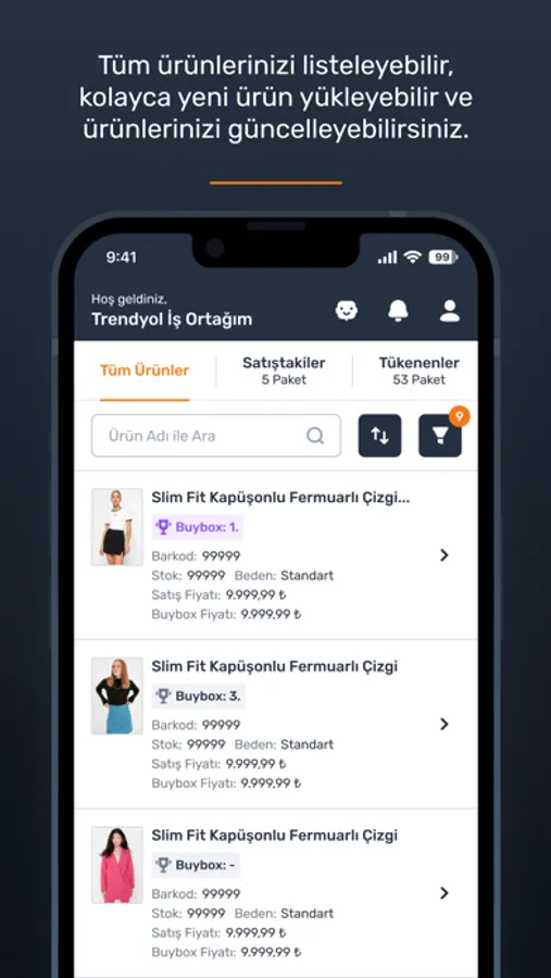 - Ürünlerinizi listeleyebilir, aratabilir ve satışta olan/tükenen ürünlerinizi takip edebilirsiniz.