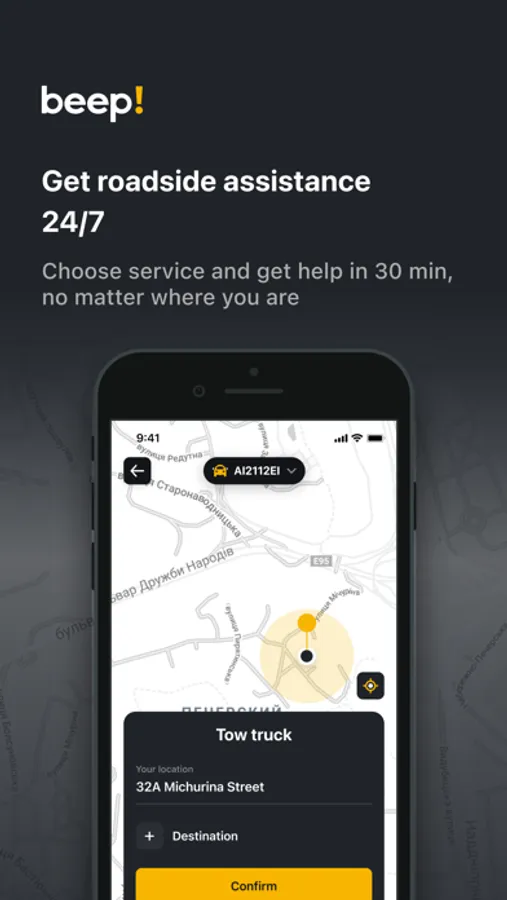 Our convenient app can be used anytime, anywhere. Help should arrive within 30 minutes and is available throughout Ukraine.
