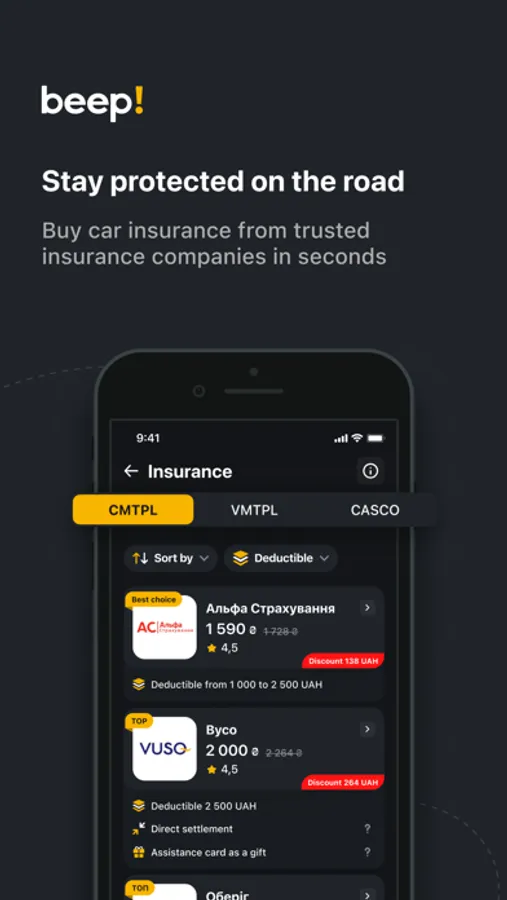 Beep! - is a free application that makes owning and driving a car more enjoyable, simpler and cheaper. With Beep! you can: buy car insurance online, pay fines, search for fuel stations and parking, call for a tow truck or other roadside assistance - all on one platform!