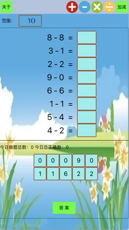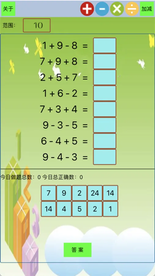 1. 软件提供了加法,减法,乘法,除法以及混合加减法五类运算。每点击一次加减乘除符号会更换一组题目。