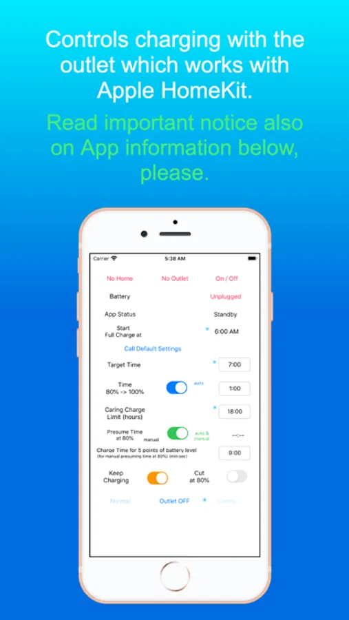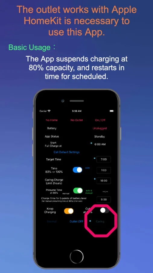 It's almost impossible to stop charging at 100% or 80% (on 'Caring' mode) capacity finally due to restriction of iOS, so the App send notification especially with sound on the situation. (Works well with the Shortcuts App set to turn off the outlet at the level of the capacity each.)