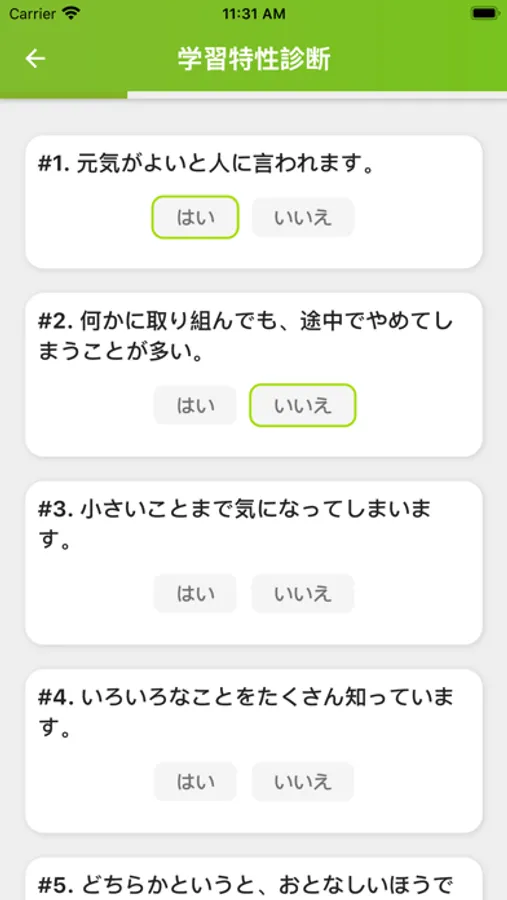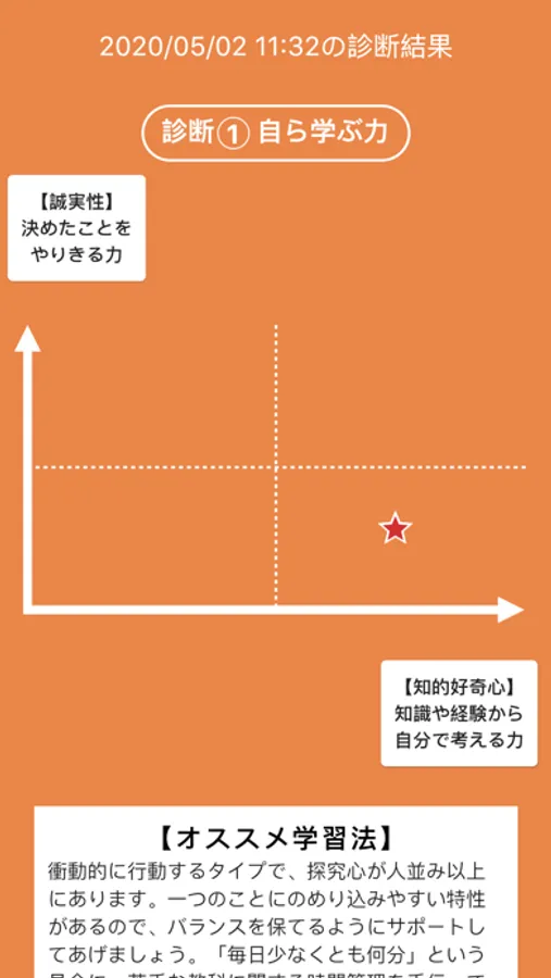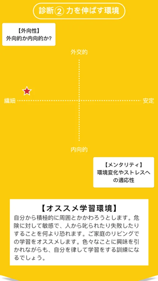 このアプリでは、科学的な性格特性分析では最も信頼性が高いとされる「ビッグファイブ」に基づき、たった24の質問に答えるだけで、お子様の学習特性を可視化することができます。解答は統計的に分析され、お子様の学習特性が4つの視点から数値化されます。診断に要する時間はたったの3分です!