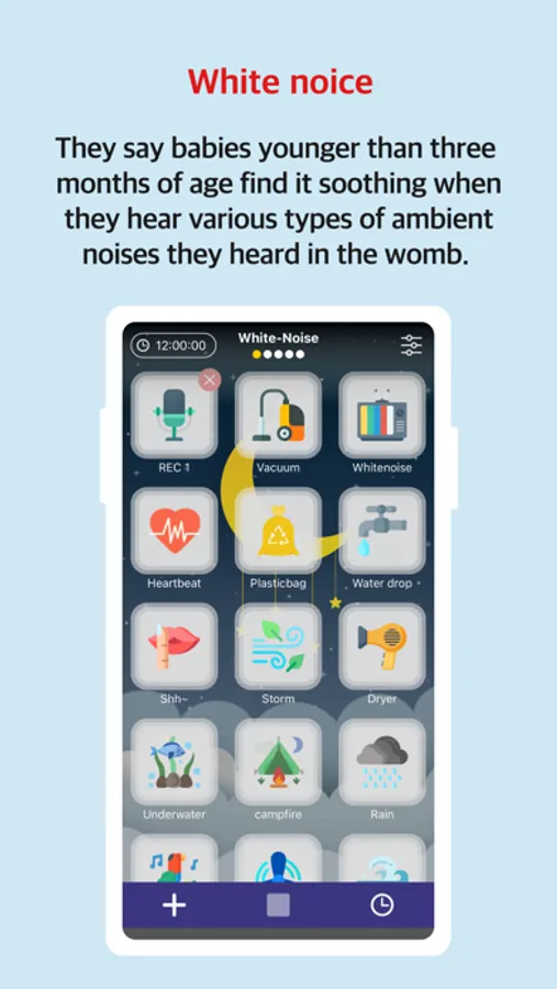 Firstly, it is white-noise. For those babies under 3 months old, they easily fall asleep while listening to mother’s heartbeat, water drops, cloth brushing sound, etc. So, it is equipped with a function to play up to maximum three (3) sounds (you can select from fifteen (15) sounds of white-noise, that are similar to the environment inside mother, such as TV noise, cleaner sound, heart-beat, vinyl bag, etc.) at the same time