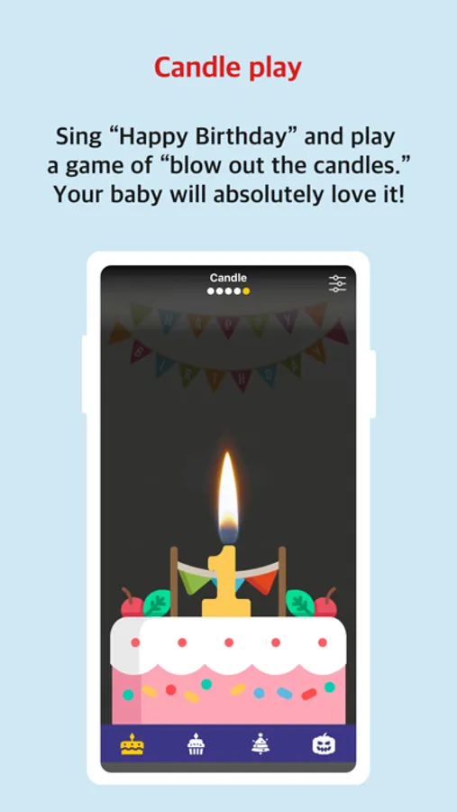 The fourth feature is singing "Happy Birthday." Have fun celebrating your baby's birthday and play a game of "blow out the candles."