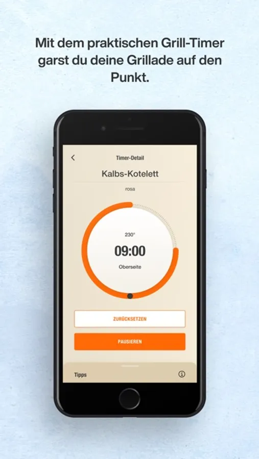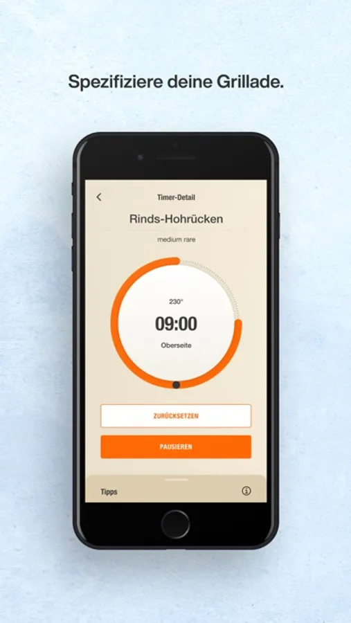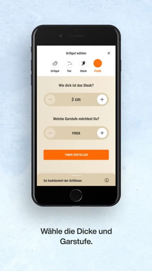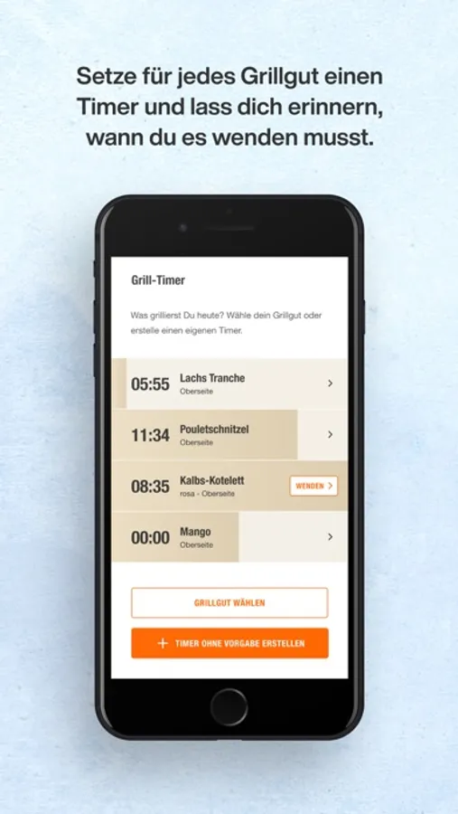 Einfach ein Grillstück auswählen und den Timer starten. Unsere Kulinarikexperten haben für alle vordefinierten Grillstücke die perfekten Garpunkte ausgewählt.
