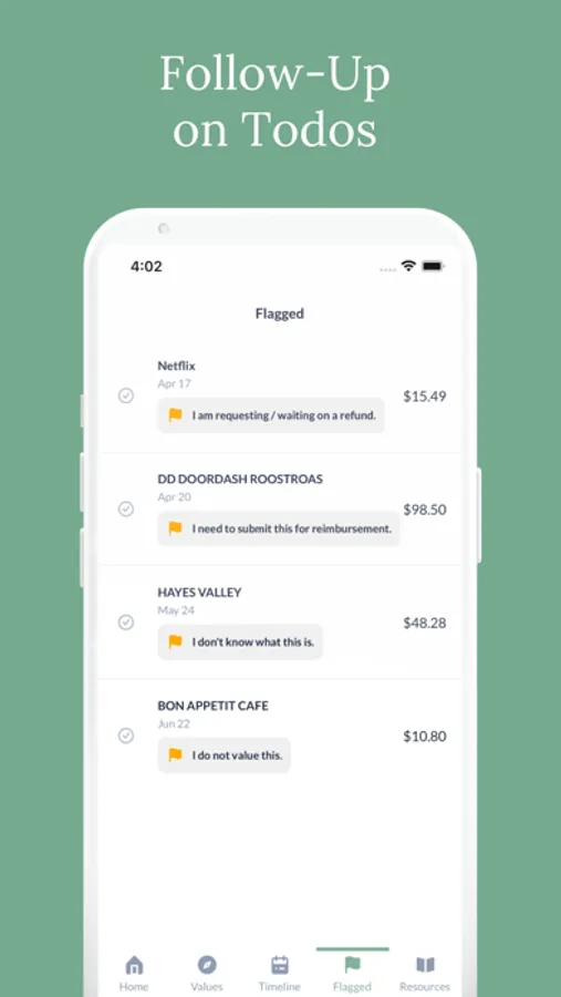 Be aware of the values that motivate your spending. Tag the values you want to track or celebrate. Flag things that deserve a second look. Offload your to-do’s — such as unrecognized expenses, refund requests, or subscription cancellations, so you can free up mental space.