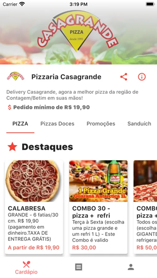 Delivery Pizza Casagrande na palma da sua mão. Faça seus pedidos de forma rápida e simples. Aproveite nosso aplicativo com preços e vantagens exclusivas, como: