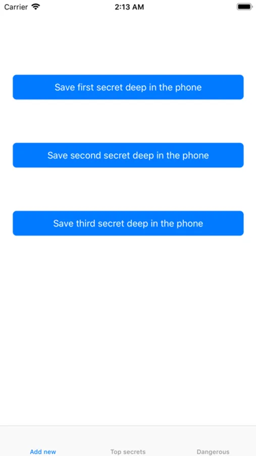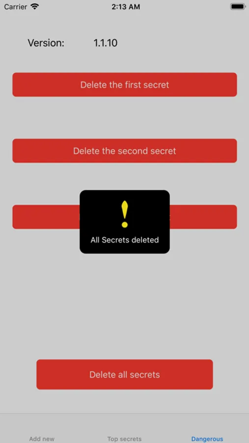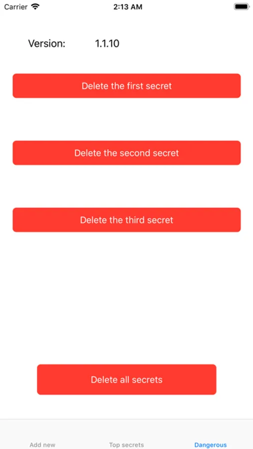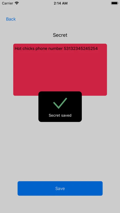 With Top secret you can keep your secrets totally hidden. Install the app, save up to 3 secrets (up to 300 character per secret) and delete the app. The entries will be stored securly and deep in your device (just that device!). If you want to see it again, just install the app again from app store and see it. After deleting the secret, you are not able anymore to get it back. All data will be store on your phone locally and other apps are not able to access to your data. You data will not be store in cloud or any place except you device.