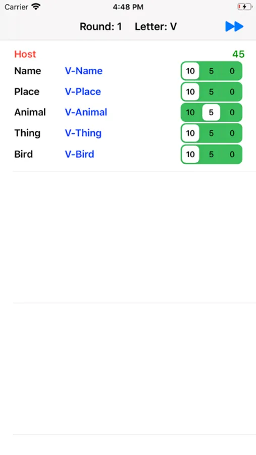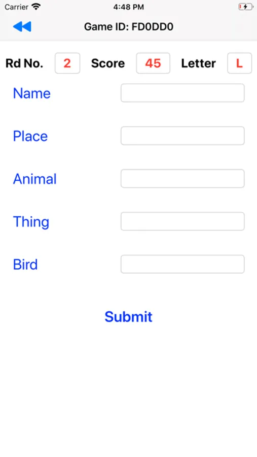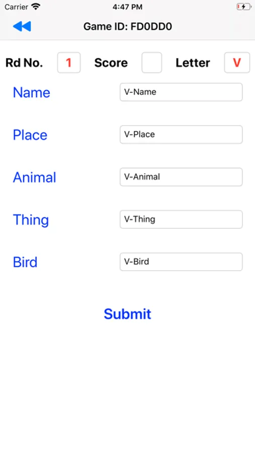 4. Round Letter will generate randomly and all players has to start entering Name, Place, Animal etc., with that letter