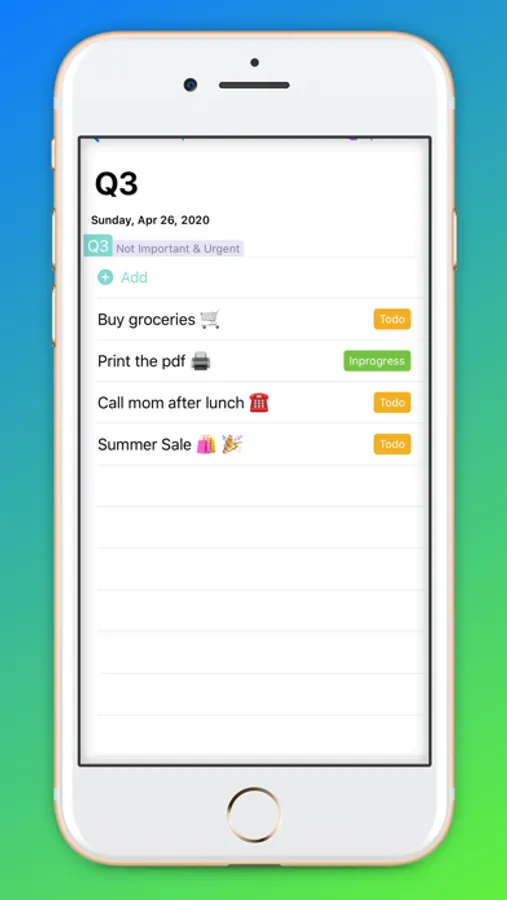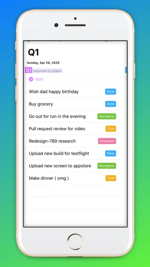 This app is a UI representation of the 4 quadrant matrix; beautiful and simple to the core. Every action/task must go into one of the 4 quadrant. The app explicitly helps you do more of Q1 and Q2 where you get more bang for the bucks. And yet, it's just another task manager; with just this exception.