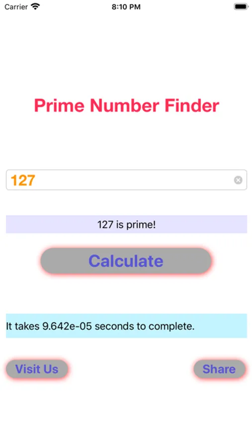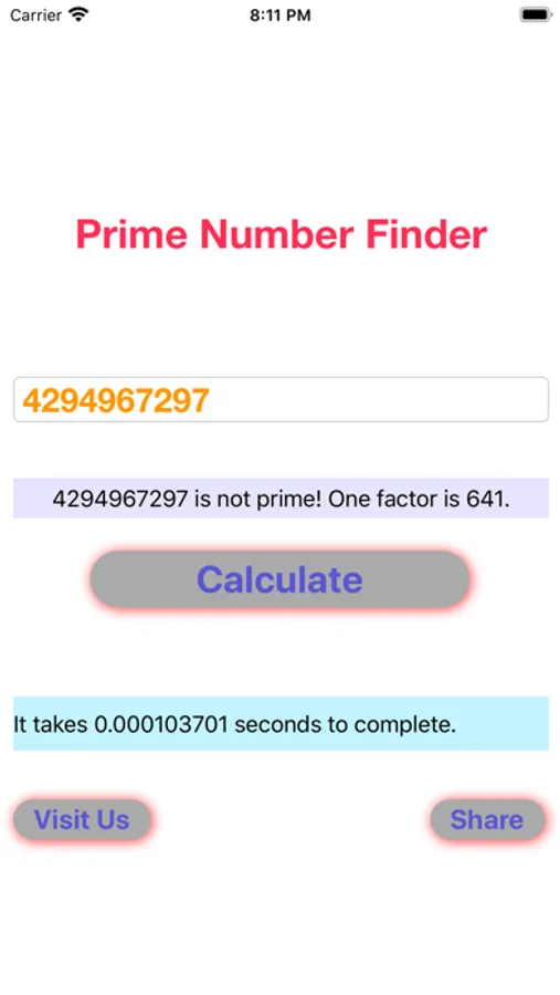 "Find Prime Num" allows you to find out if a number is a prime or not. It will also give you a factor of this number. In addition, it will tell you how long it takes for the app to calculate, which indicates how fast your device is. You can use this value to test your device's processing speed against other devices.