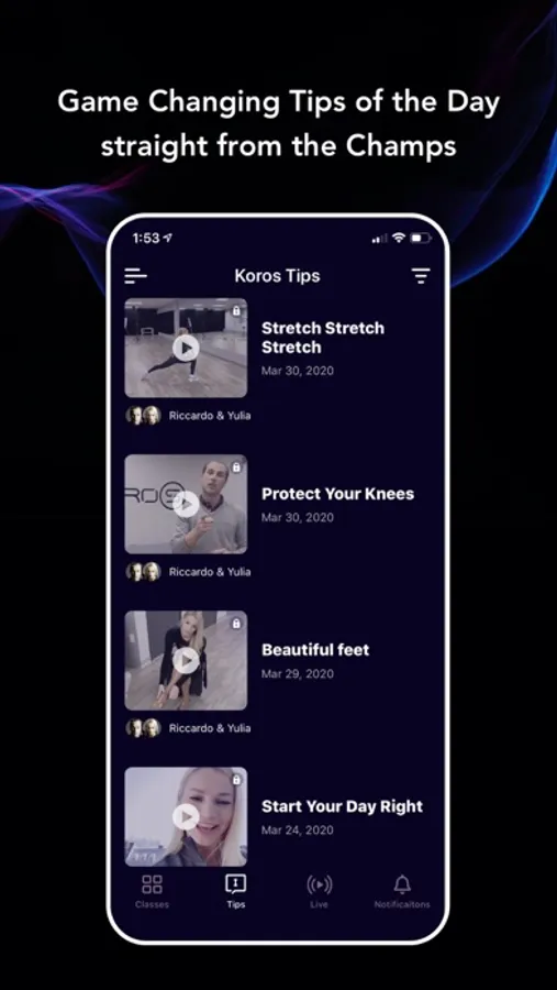 Never miss a day of dance ever again. You can literally take a class with the world champions everyday from now on. Live classes include; Riccardo and “Yulia technique” and Riccardo and Yulia “how to compete”. Donnie and Heidi “technique”. Over 30 World Champion titles between these four. Also, Koros Fit, Koros Style, Koros Talk and more. Tips of the day plus prerecorded classes where the World Champions, first demonstrate then breakdown and analyze their own dancing just for you to watch whenever you want. Laptop, tablet or phone, all your devices, all the time. Now you can take lessons from the World Champions anywhere. Koros makes the world your dances studio.