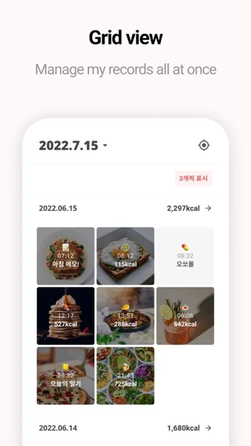 Collect timestamps, calories, and photos of what you have eaten at a glance like a gallery.