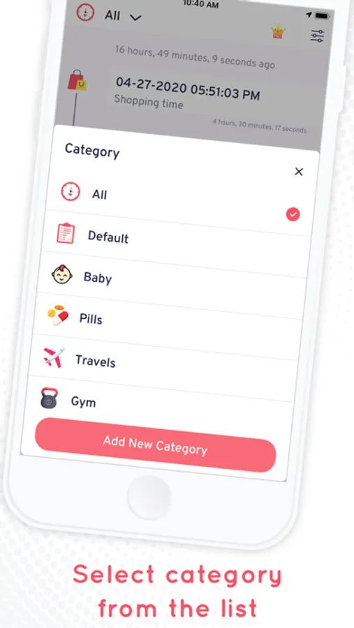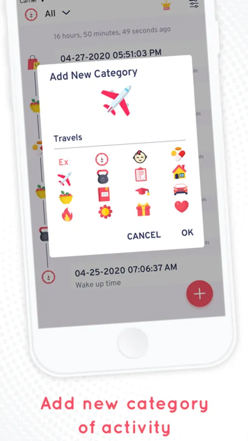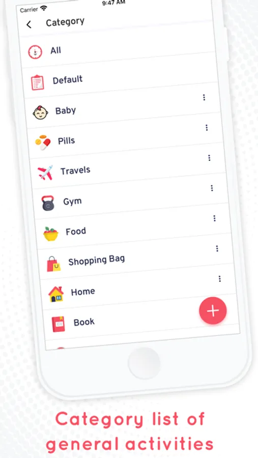• Available categories: All, Default, Baby, Book, Food, Gym, Home, Pill, Travel , Cap , Car , Flame , Flowers , Gift , Heart , Hospital, Map , Money , Movie, Music, Night , Pet , Phone , Pizza, Shopping Bag, Sport, Stop Watch, Train, Water, Weather