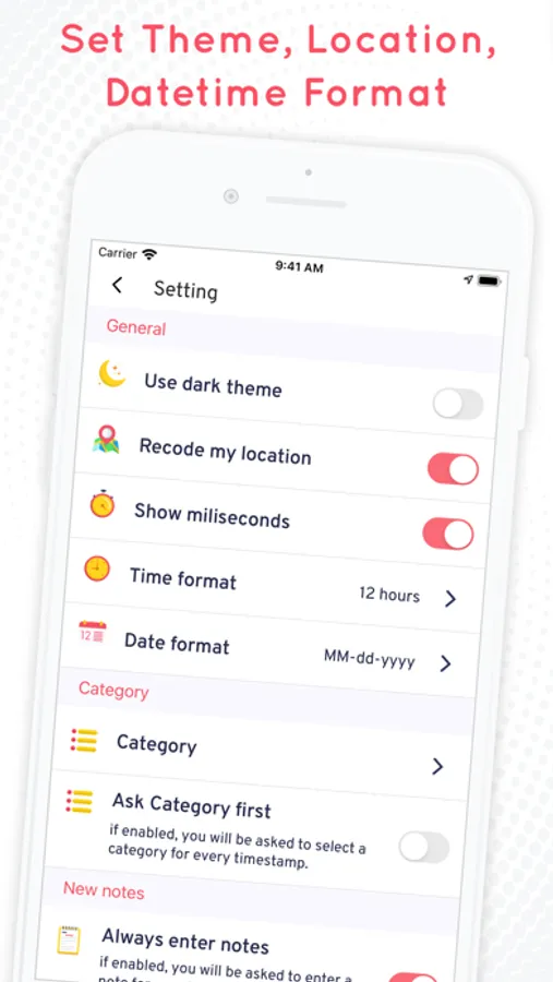 • On/Off toggle available to Set theme, Location,or to show miliseconds
