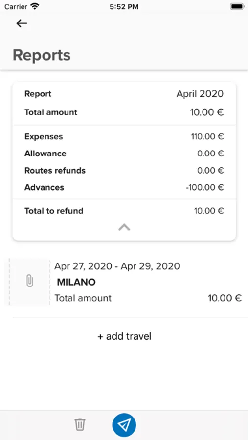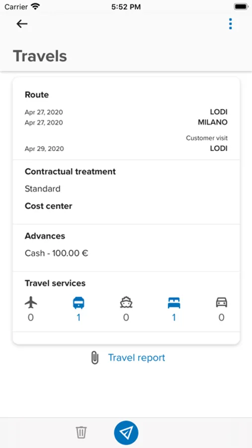 The travel expenses insertion takes place with the management of financial movements, the combination with credit card transactions, the indication of the descriptive details of the expense, the itinerary, the mileage reimbursements and the association of digital attachments and photographs taken directly from a mobile device.