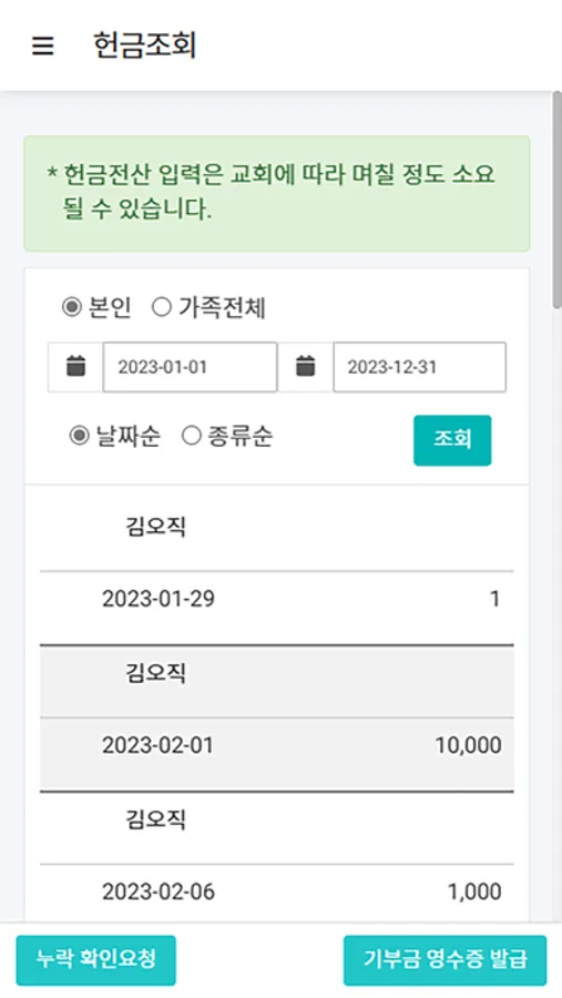 로그인이 안 될 경우 교회 사무실에 문의하셔서 이름과 핸드폰번호가 올바르게 등록되어 있는지 확인해주시기 바랍니다.