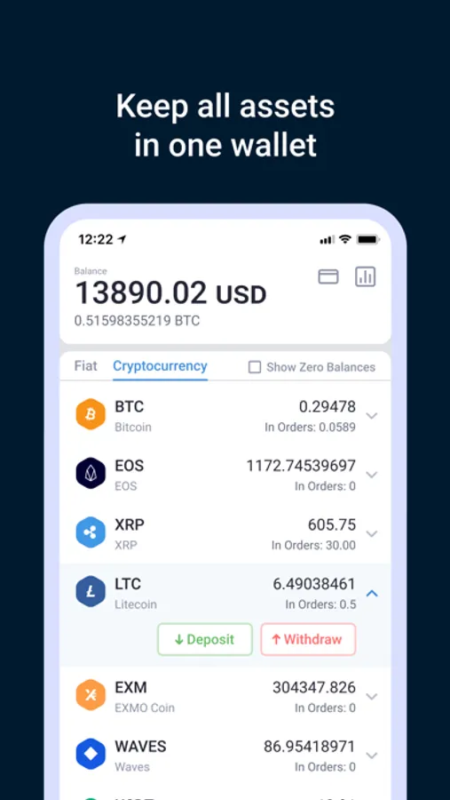 Use the app as a wallet to safely store your funds. More than 57 cryptocurrencies are available on EXMO, including bitcoin (BTC), ethereum (ETH), litecoin (LTC) and ripple (XRP), as well as fiat currencies such as dollars, euros and pounds. Your wallet is reliably protected by the LedgerVault technology and is available at any time.