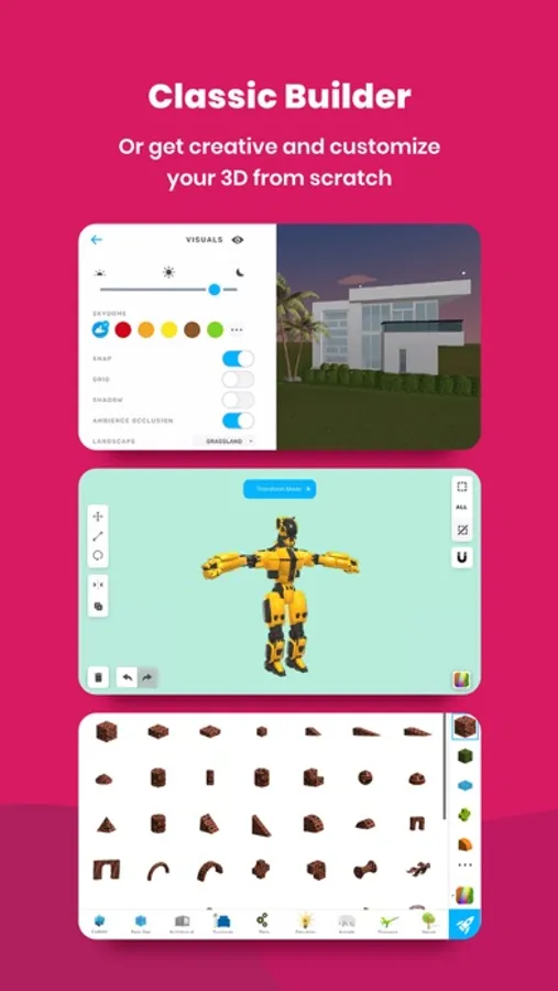 Alternatively, get creative by making your own models from scratch with our Classic Editor. Pull up thousands of basic shapes, colors, and textures, then transform them into something amazing.