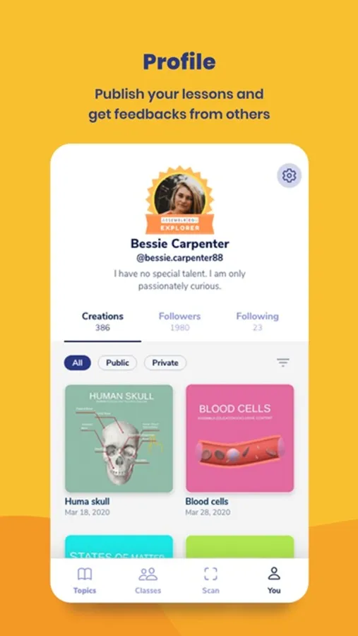 Get some insights by discovering other teachers and students’ awesome AR projects in the app. Be part of the EDU community by setting up a profile and publishing your projects or lessons in the app. Let the world discover your amazing materials!