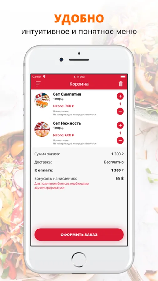 Заказывайте ваши любимые блюда у нас, и Вы останетесь довольны качеством сервиса. У нас работают лучшие повара, а курьеры приятно порадуют вежливостью и быстрой доставкой.