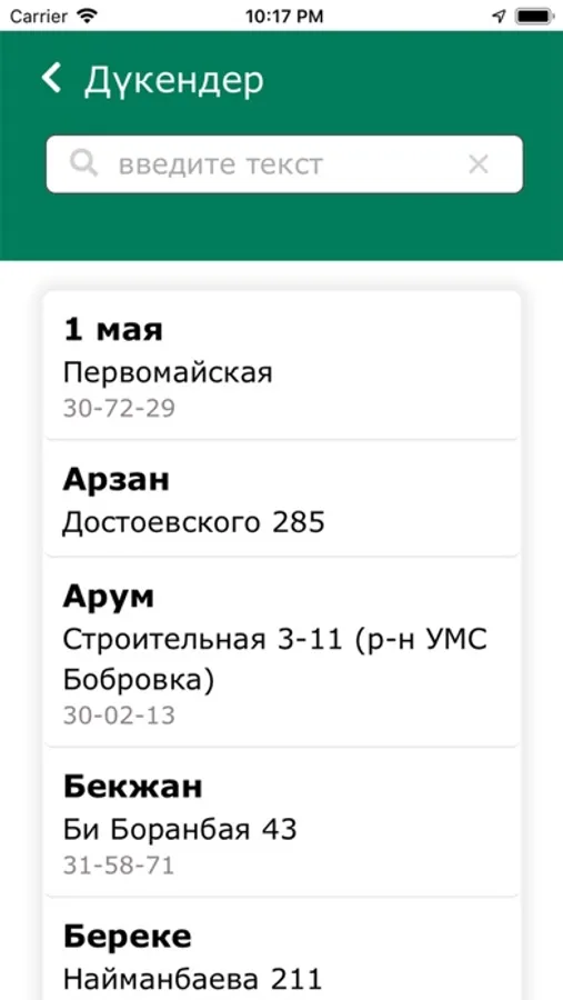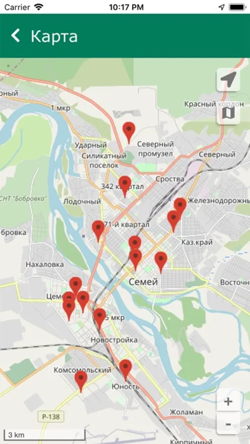Раздел Карта отображает адреса всех магазинов на карте города, нажатие на маркер магазина выводит краткую информацию и дает возможность перейти в окно со списком всех продуктов.