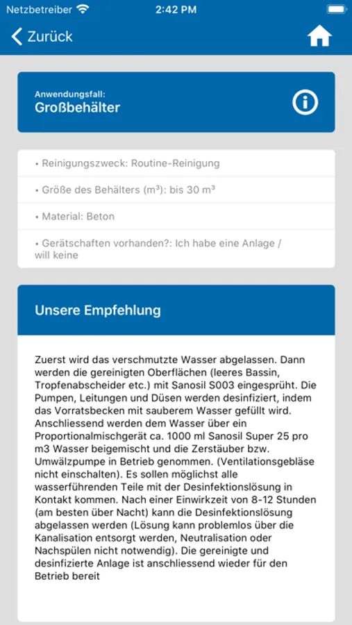 2. Sofort ein Ergebnis geeigneter Sanosil Produkte mit konkreten Anwendungsinformationen erhalten