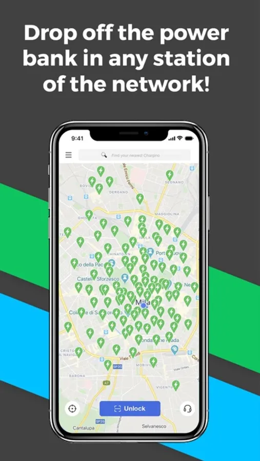 Chargino is the number one power bank sharing network in Italy. It has a network of stations spread throughout the city, where you can pick up a power bank to charge your mobile phone when you need it most. You no longer have to carry around clumsy power banks or extra cables. Each power bank has three integrated cables: Lightning, USB-C and MicroUSB.