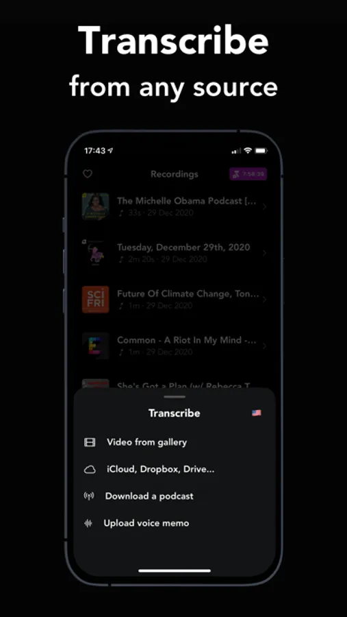 Transcribe audio recordings or videos directly on Aria, or upload from your camera roll.