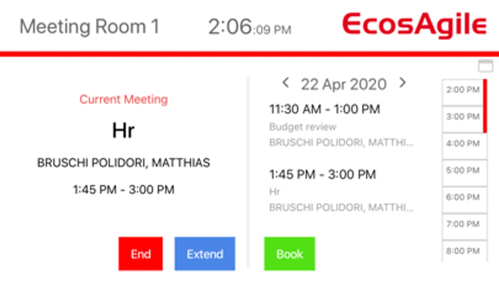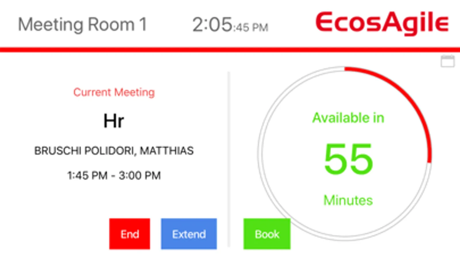 The APP shows a panel with the meeting room situation for the meeting room (meetings in progress, upcoming meetings, calendar, room feature, etc.) and allows the management of meetings (booking, cancellation, extension directly from its display, etc.).