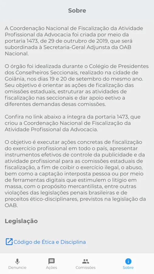 A ferramenta Fiscalização OAB foi desenvolvida para recepcionar denúncias envolvendo o exercício profissional da advocacia em todo o país, a fim de coibir o exercício ilegal, o abuso, bem como a captação interposta pessoa ou por meio de ferramentas digitais que estimulem o litígio em massa, com o propósito mercantilista, entre outras violações das legislações penais brasileiras e de preceitos ético-disciplinares, previstos na legislação da OAB.