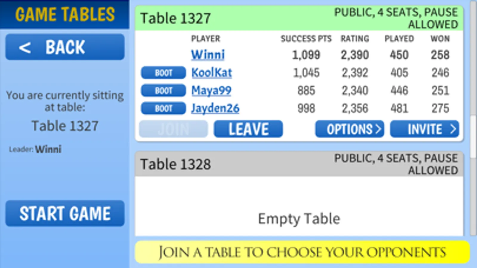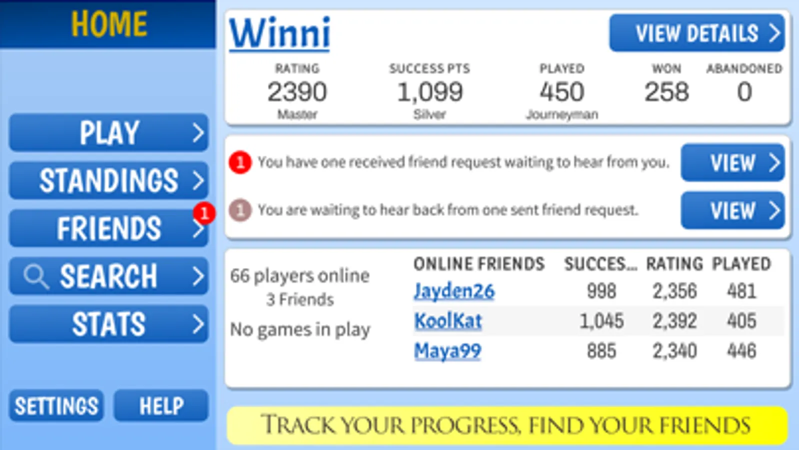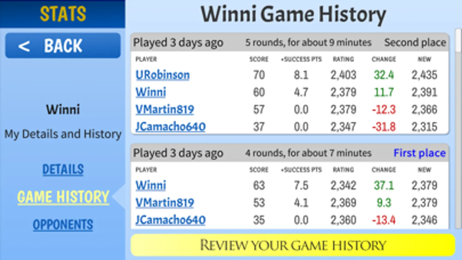 As you play, you will develop a skill rating similar to a chess rating. This reflects your overall ability and is used to match you against other players of similar skill. But you can choose to play against a player of any level – if they will accept!