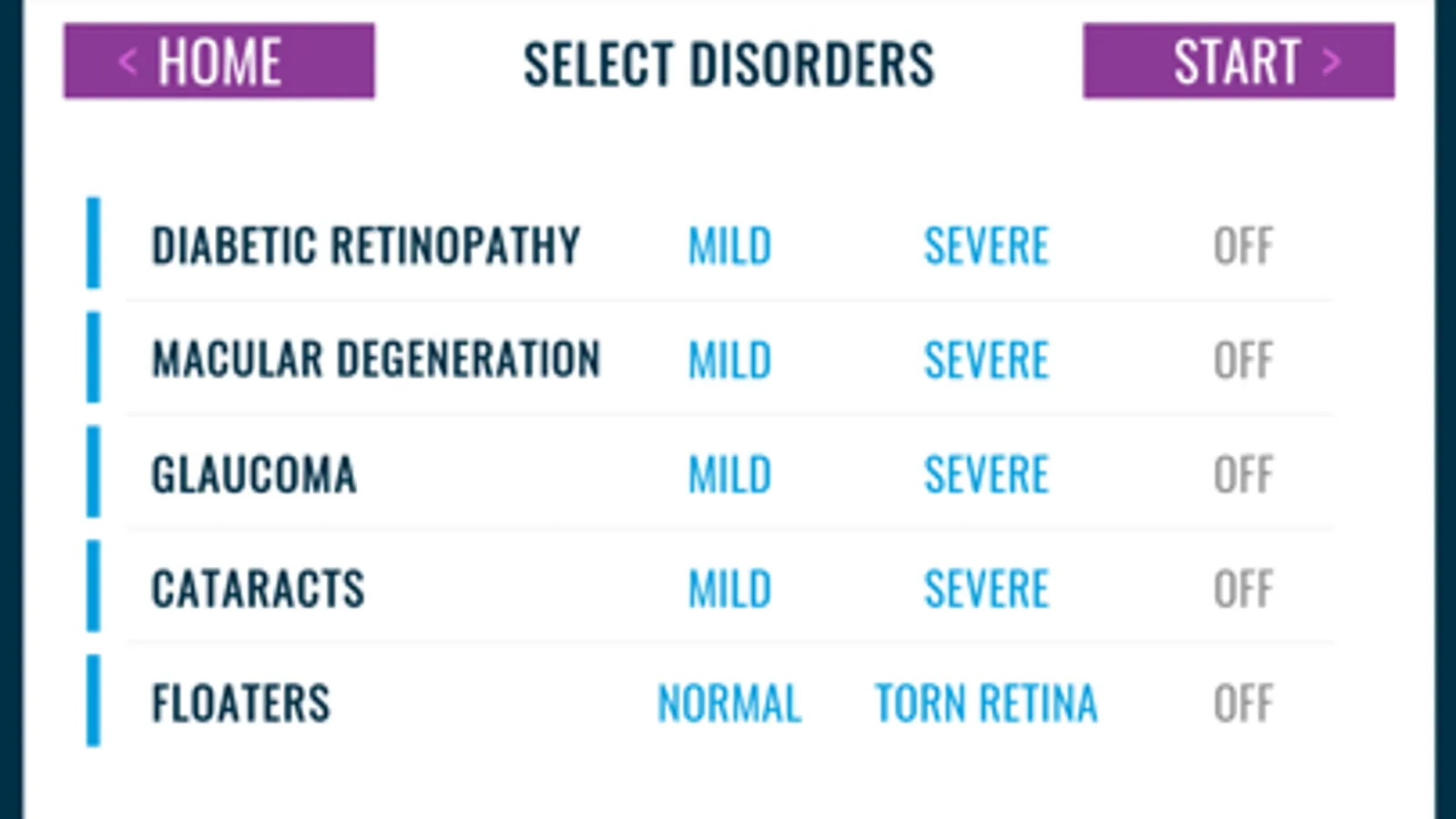 This app contains representations of mild and severe forms of different vision disorders and conditions. Using a mobile device headset with rear-facing camera support, you can immerse yourself for a better understanding of living with these conditions.