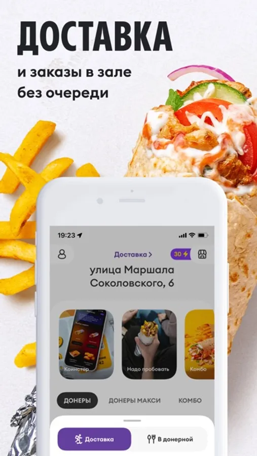 - Заказывай в три тапа на доставку или по пути в донерную, чтобы не стоять в очереди!