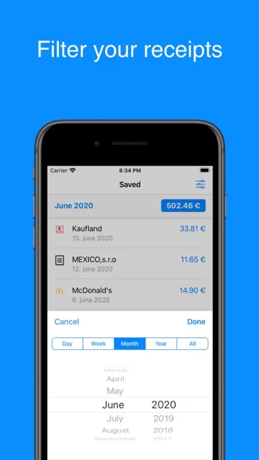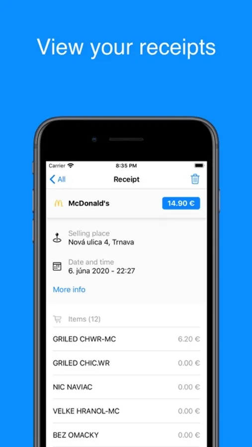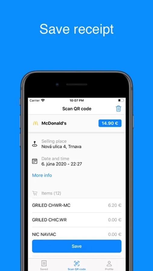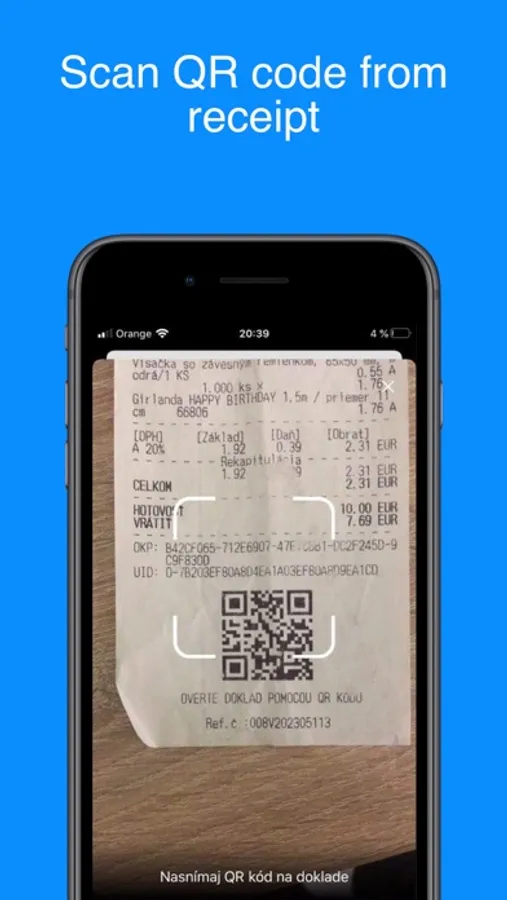With application Uloz doklad you can easily scan the QR code from the cash register receipt and with that verify it and save it. After being scanned, it is possible to view all the data from the receipt and after log in it’s possible to save the receipt. Saved receipts can be viewed and filtered by date, month and year.
